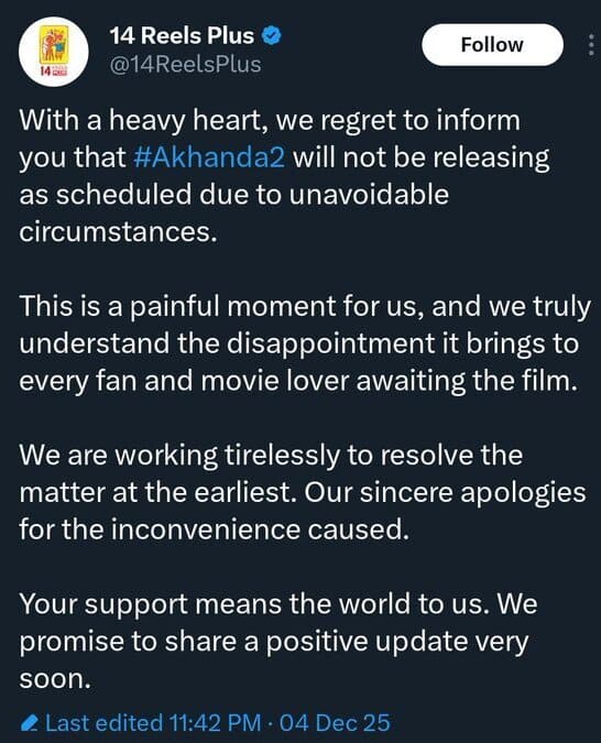ఫ్లాష్ .. ఫ్లాష్ అనుకోండి.. బిగ్గెస్ట్ బ్రేకింగ్ అనుకోండి.. తెలుగు సినిమా చరిత్రలో, ఇలాంటి ఒక రోజు వస్తుందని ఎవరూ ఊహించి ఉండరు. 50 ఏళ్లుగా సినీ పరిశ్రమలో నటుడిగా వెలుగుతున్నారు బాలకృష్ణ. ఆయన నటించిన కొత్త చిత్రం అఖండ -2 డిసెంబర్ 5న ప్రపంచ వ్యాప్తంగా విడుదలకు సిద్ధమైన సంగతి తెలిసిందే. పైగా పాన్ ఇండియా వైడ్ గా మూవీని రిలీజ్ చేయడానికి ప్లాన్ చేయడంతో, భారీ ఎత్తున ప్రమోషన్ నిర్వహించారు. కట్ చేస్తే ముందు ఒక రోజు ముందు పడాల్సిన ప్రీమియర్స్ రద్దు అయ్యాయి. అన్నిటికి మించి సినిమా డిసెంబర్ 5 నుంచి పోస్ట్ పోన్ అయింది.